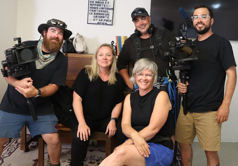 On aperçoit l’équipe de tournage : Gilles Doiron (directeur photo), Isabelle Ménard (animatrice), Serge Arseneault (réalisateur et prise de son), Francine Hébert (coordonnatrice du tournage)