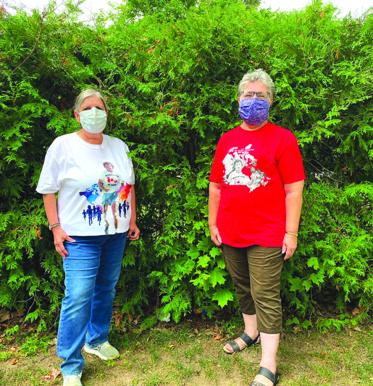Sous ces masques on retrouve Shirley Vaillancourt de Barrie et Louise Attwood de Midland qui sont des participantes assidues à la marche Terry Fox. Les