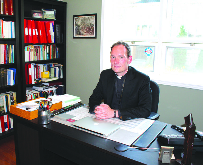 Père Michael Knox à son bureau du Sanctuaire des martyrs. Le Sanctuaire accueille près de 120 000 pèlerins entre mai et octobre. Le tourisme religieux