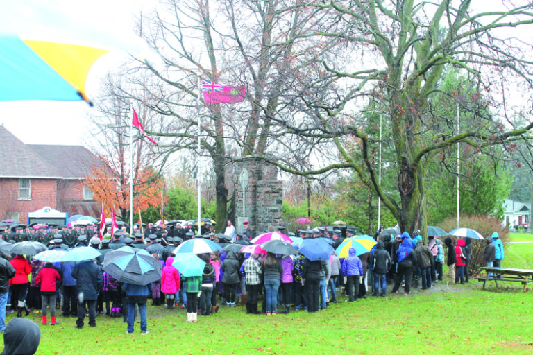C’est sous une pluie battante que l’aumônier Mark Wolfe en compagnie de Dave Sampson, retraité des Forces canadiennes et responsable de la vente des coquelicots