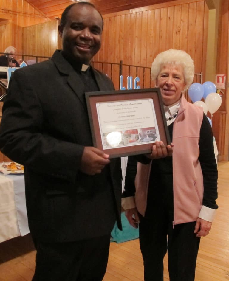 Père Luc Samba, Curé associé de la paroisse Sainte-Croix de Lafontaine, est très heureux de recevoir un certificat de la part de Georgette Robitaille, soulignant