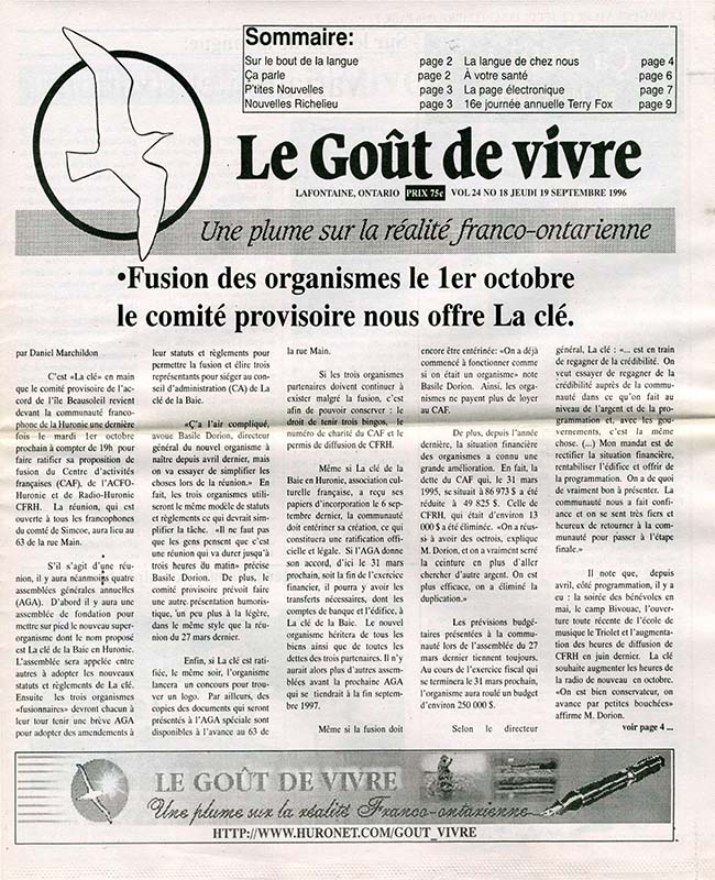 Le Goût de vivre (Vol.24 No.18) – 19 septembre 1996