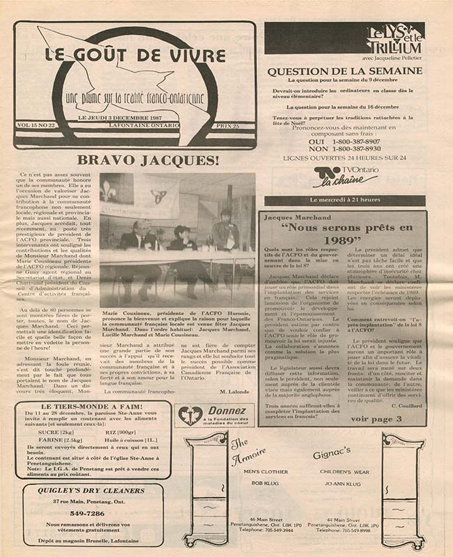 Le Goût de vivre (Vol.15 No.23) – 3 décembre 1987