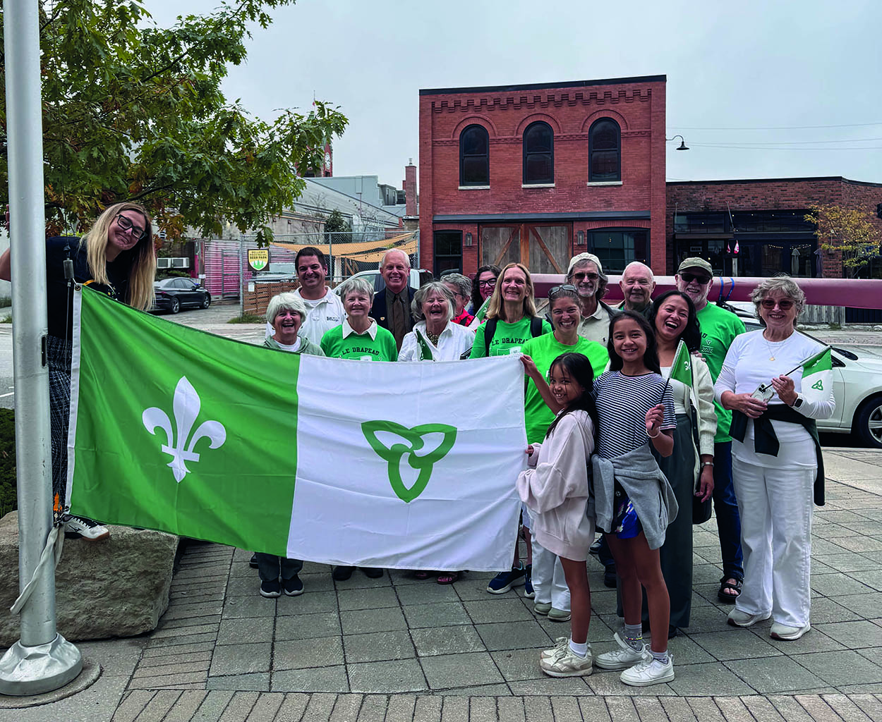 Leona Noche coordonnatrice du service de formation aux adultes de La Clé et Caroline Boisvert formatrice, ont coordonné le hissement du drapeau à l’hôtel de ville de Collingwood avec des apprenantes et des membres de la communauté. Le maire adjoint de Collingwood, Tim Fryer a participé au lever du drapeau franco-ontarien.